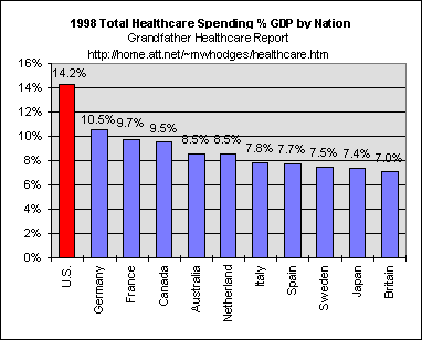 April 15, 2005 The New York Times (Paul Krugman): In 2002, the latest year for which comparable data are available, the United States spent $5,267 on health care for each man, woman and child in the population. Of this, $2,364, or 45 percent, was government spending, mainly on Medicare and Medicaid. Canada spent $2,931 per person, of which $2,048 came from the government. France spent $2,736 per person, of which $2,080 was government spending. Amazing, isnt it? U.S. health care is so expensive that our government spends more on health care than the governments of other advanced countries, even though the private sector pays a far higher share of the bills than anywhere else.
